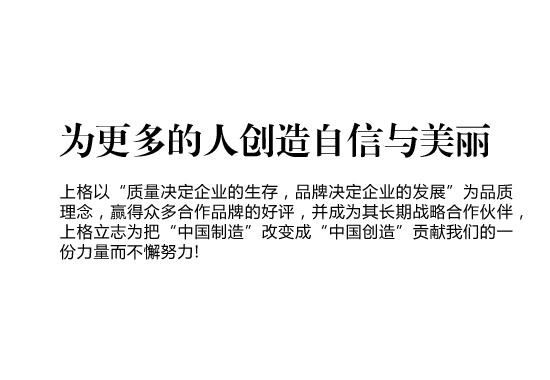 • 上格一路走來,以“締造時尚集團(tuán),使公司受人尊敬,令人向往;為客戶提升價值,創(chuàng)造成功;讓員工提高生活品質(zhì),實現(xiàn)自我價值”作為我們的目標(biāo),“為更多的創(chuàng)造自信與美麗” 作為我們的使命,立志為把“中國制造” 改變成“中國創(chuàng)造”貢獻(xiàn)我們的一份力量而不懈努力!